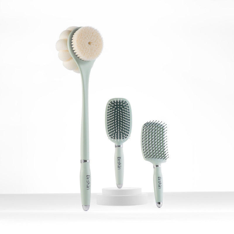 'مجموعة العناية بالجسم تمنح تأثير منعش وتساعد على ازالة الجلد الميت مع فرشة لتدليك الشعر اثناء الإستحمام وفرشة للشعر لفك التشابك بعد الاستحمام وبأي وقت