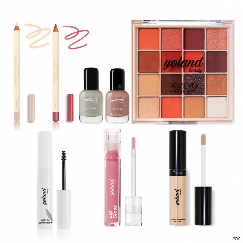 طقم ميكب من يولاند بيوتي يحتوي على جميع أساسيات المكياج لإطلالة يومية كاملة. يشمل ظلال عيون، طلاء أظافر، محدد شفاه، كحل، كونسيلر، قلوس، ومسكرة حواجب شفافة.